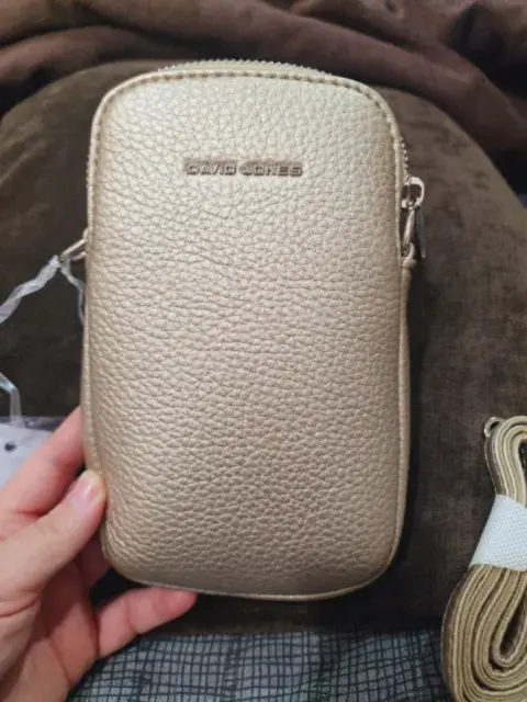 Crossbody David Jones. Bolso cruzado con espacio suficiente para celular, además tiene compartimento para tarjetas, correa en piel sintética en un bello y sutil tono dorado. Totalmente nueva con etiqueta y cubre polvo.