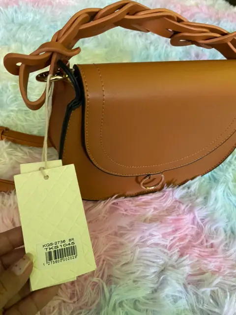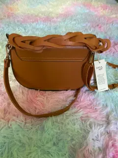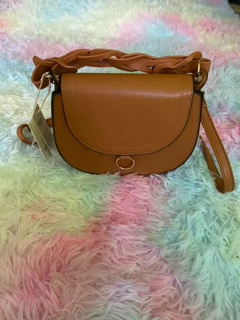 El bolso cruzado perfecto, adornado con una correa trenzada con asa superior. Detalle de cierre a presión con bolsillo interior. Detalle de herraje de anilla circular, nuevo con etiqueta de piel vegana.
