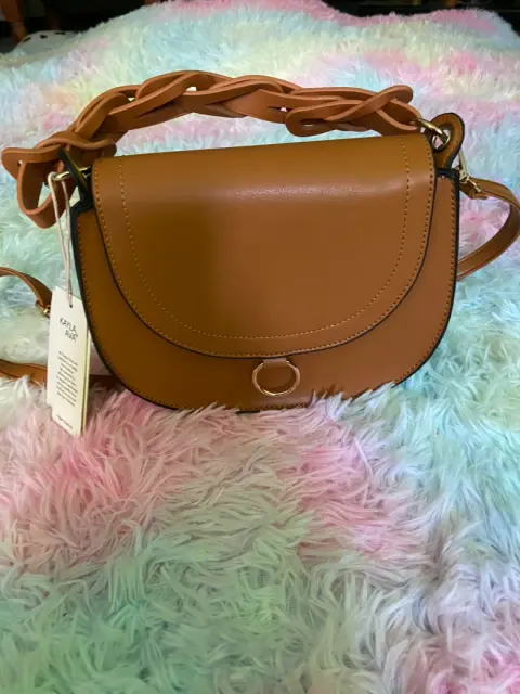 Crossbody Kayla + Ava. El bolso cruzado perfecto, adornado con una correa trenzada con asa superior. Detalle de cierre a presión con bolsillo interior. Detalle de herraje de anilla circular, nuevo con etiqueta de piel vegana.