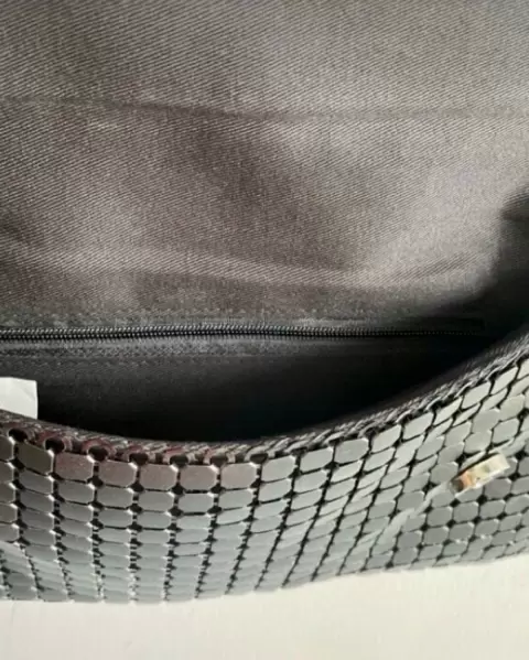 La bolsa esta hecha de metal por fuera y forrada en tela, mide 13 centímetros de alto y 22 cm de ancho, está en excelente estado, solo tiene pequeños rayoncitos en algunos cuadritos de metal pero por cámara no se logran ver.