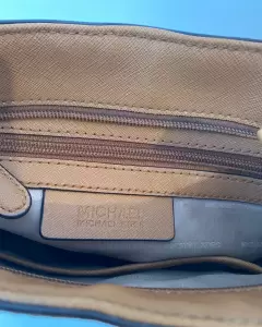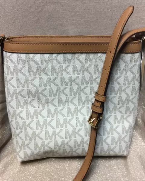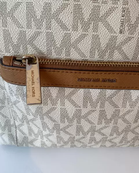 Crossbody monogram MK beige, está en Perfecto prestado, los únicos detalles son en el metal, cómo se muestra en la 4ta foto