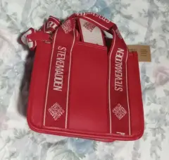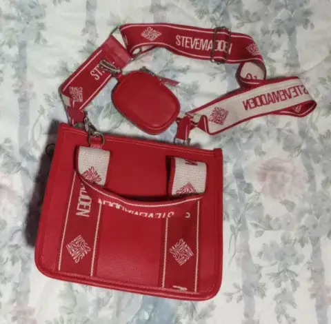 Crossbody piel sintética color rojo, con correa y asas de tela en rojo con el logo de la marca en color crudo y hebilla metálica, viene con un monedero desmontable de piel sintética rojo con cierre metálico, se cierra mediante dos botones metálicos, por dentro la tela es color crudo y tiene el estampado de la marca, tiene un bolsillo interno con cierre, dos compartimentos internos, medidas: alto 20cm, largo 23cm y ancho 13cm