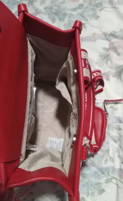 Crossbody piel sintética roja. Crossbody piel sintética color rojo, con correa y asas de tela en rojo con el logo de la marca en color crudo y hebilla metálica, viene con un monedero desmontable de piel sintética rojo con cierre metálico, se cierra mediante dos botones metálicos, por dentro la tela es color crudo y tiene el estampado de la marca, tiene un bolsillo interno con cierre, dos compartimentos internos, medidas: alto 20cm, largo 23cm y ancho 13cm