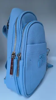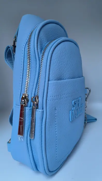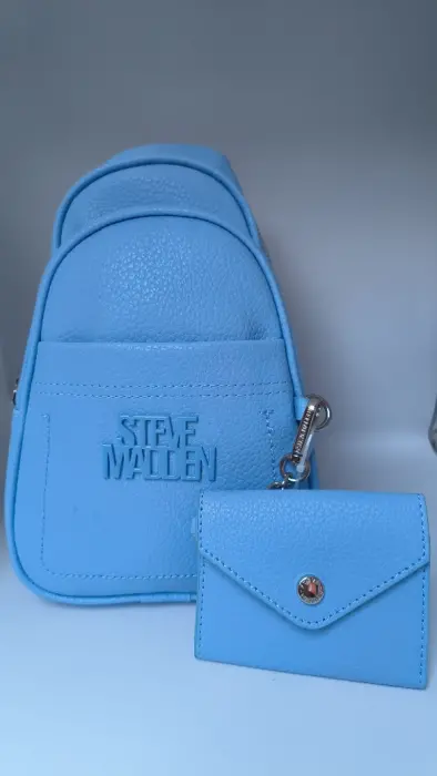 Mariconera Steve Madden Azul Cielo. Mariconera Steve Madden Azul Cielo cuenta con monedero y puedes cambiar la correa de lado, tiene tres bolsas dos con cierre y uno normal
