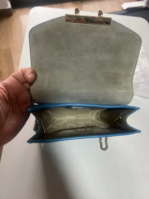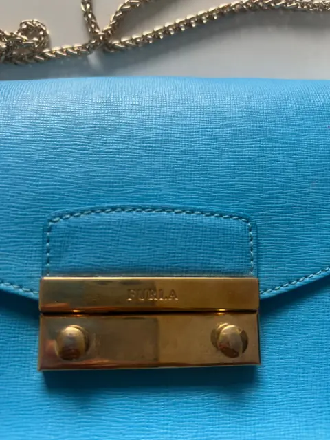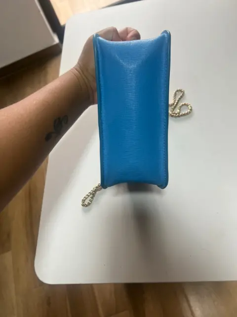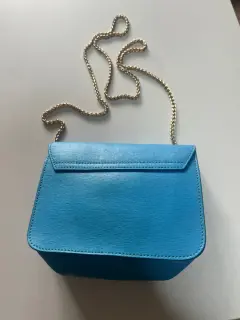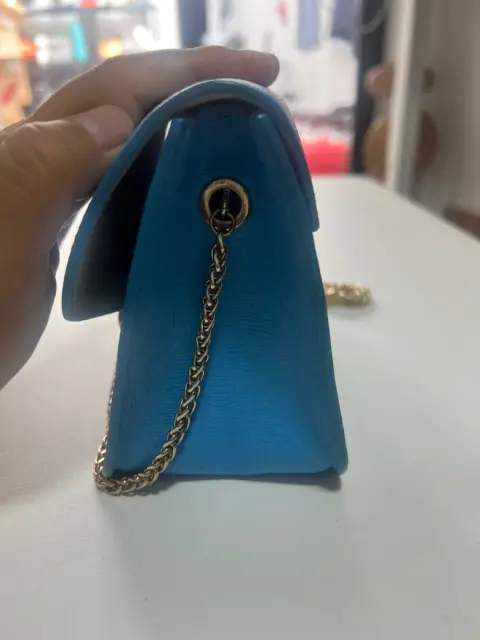 Mini crossbody azul vibrante. En excelente estado con cadena dorada, suficiente espacio para artículos esenciales, perfecta para cualquier evento dándole un toque de elegancia a cualquier atuendo. Ligero desgaste en el broche dorado casi imperceptible. Medidas 17 x 14 cm.
