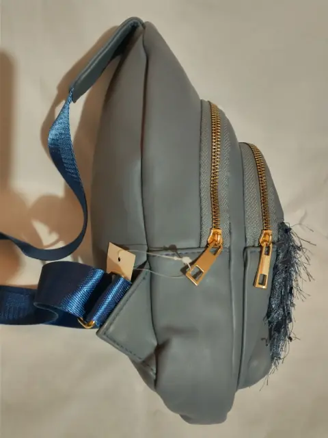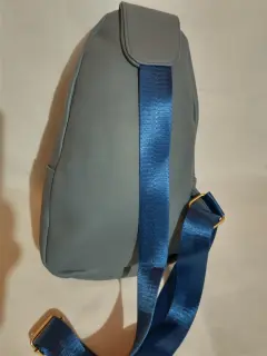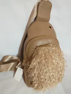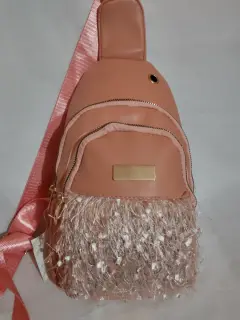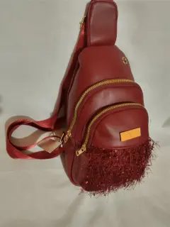 Mochila cruzada de color vino con detalles al frente,con dos compartimientos,con hombrera cruzada, medidas de 30cm por 13cm.