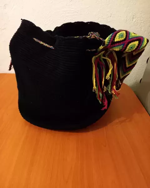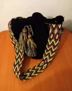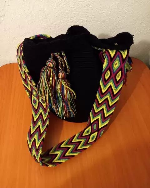Morral colombiano Wayuu color negro con correa de varios colores para llevar cruzado. Buena calidad, muy bonito.