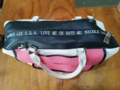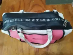 de este artículoBolsa Boston de piel vegana estampadaInterior: forro textil con logo Nicole Lee estampado, placa metálica con el logo grabado, bolsillos laterales Placa metálica de Nicole Lee grabada y zipper metálicoNo incluye correa para el hombro Medidas: 33.02 x 21.5 x 15.2 cm. Peso: 900 gr