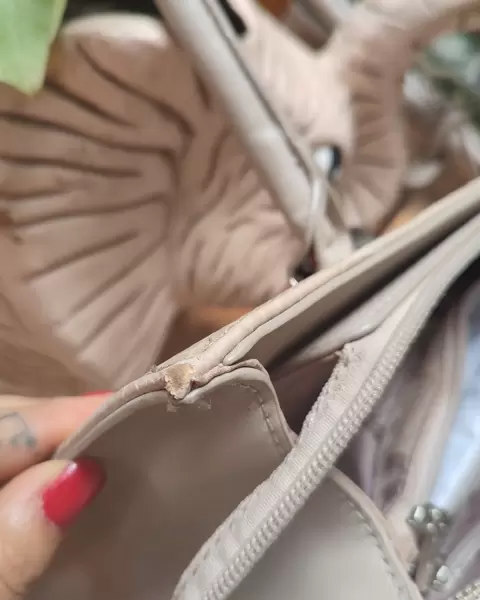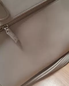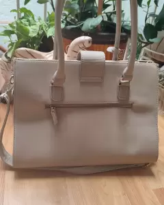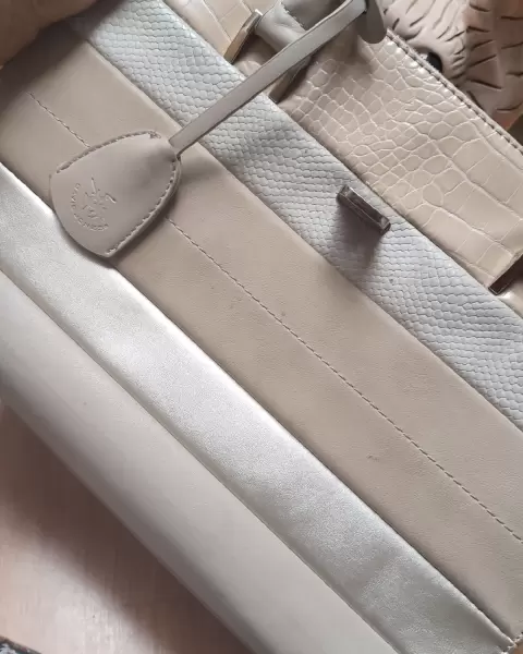 Bolsa aperlada David Jones. Material: vinipiel, super ejecutiva, del frente tiene tipo piel de víbora y losa, tiene detalles medio descarapelados en las orillas, el color es tipo aperlado súper bonita