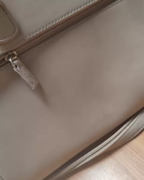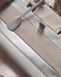 Material: vinipiel, super ejecutiva, del frente tiene tipo piel de víbora y losa, tiene detalles medio descarapelados en las orillas, el color es tipo aperlado súper bonita