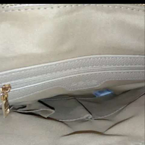 Bolsa bandolera marca resaltada en dorado, asas y correa, forrada por dentro.