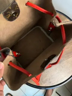 Bolsa café con tirantes rojos. Bolsa de tamaño mediano con tirantes rojos, muy buen espacio y en buenas condiciones.