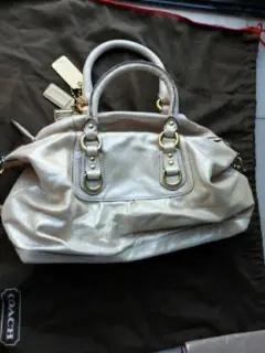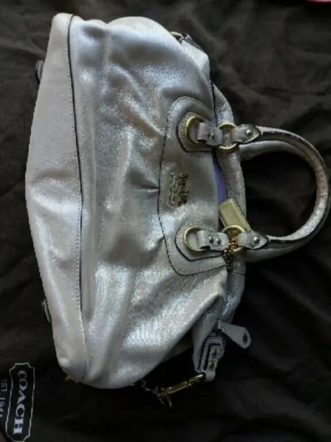 Bolsa Coach Madison Sabrina Shimmer. Edición limitadainterior tiene un bolsillo con cremallera grande y 1 bolsillo abierto El forro sedoso es de color lavanda. El exterior es un hermoso color beige brillante que parece diamantes brillantes. 3 etiquetas colgantes con cierre total de cremallera superior, un correa de hombro extraíble (20 pulgadas de largo). 13 "de largo x 5" de ancho x 9 "de alto