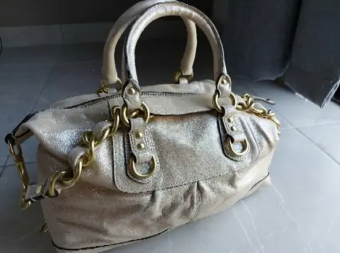 Edición limitadainterior tiene un bolsillo con cremallera grande y 1 bolsillo abierto El forro sedoso es de color lavanda. El exterior es un hermoso color beige brillante que parece diamantes brillantes. 3 etiquetas colgantes con cierre total de cremallera superior, un correa de hombro extraíble (20 pulgadas de largo). 13 "de largo x 5" de ancho x 9 "de alto