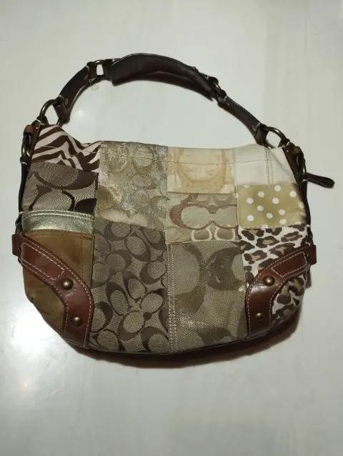 Bolsa de dama, tela y piel, marca COACH, medidas 33cms ancho, 23 Cms alto y fondo 8 cms, bolsita de cierre al interior y compartimiento.