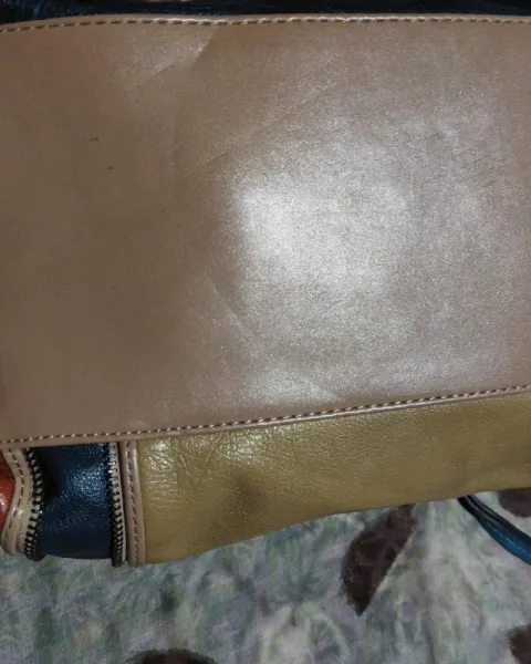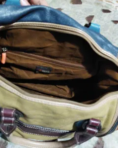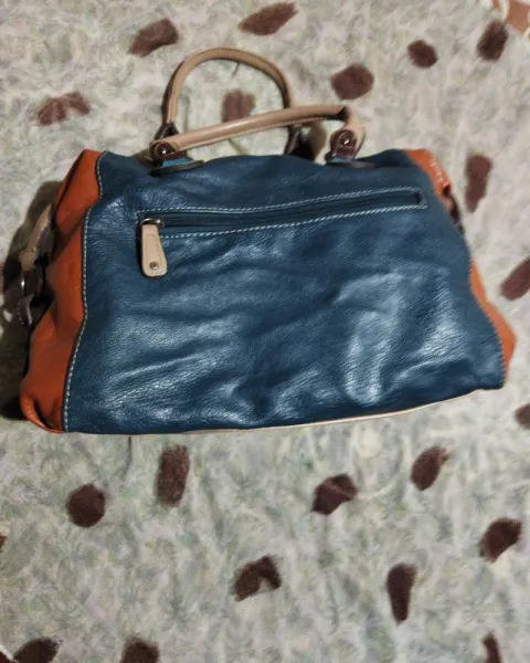 Hermosa bolsa tipo maletín, asa corta, color beige, camel, azul verdoso, muy amplía, en buen estado, cierre adentro y 2 afuera.