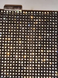 Bolsa de fiesta negra con cristales. Linda bolsa de mano tipo clutch está en perfecto estado no tiene ningún detalle solo un poquito rayadito el metal pero ha estado guardada realmente solo se usó en dos ocasiones le cabe perfectamente un celular un labial cosas muy pequeñitas es la parte de atrás es de satín y la parte de adentro también las medidas sonLargo 25cmAncho 11Profundidad 3 cm