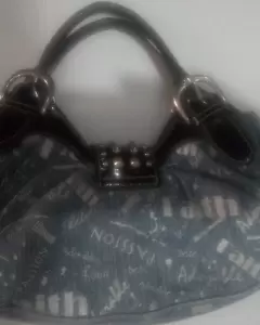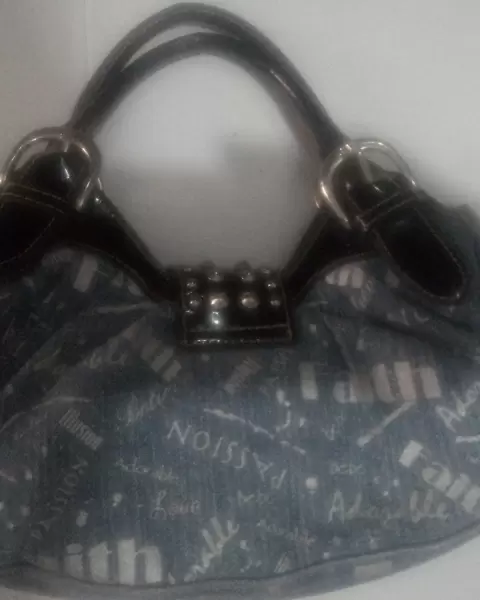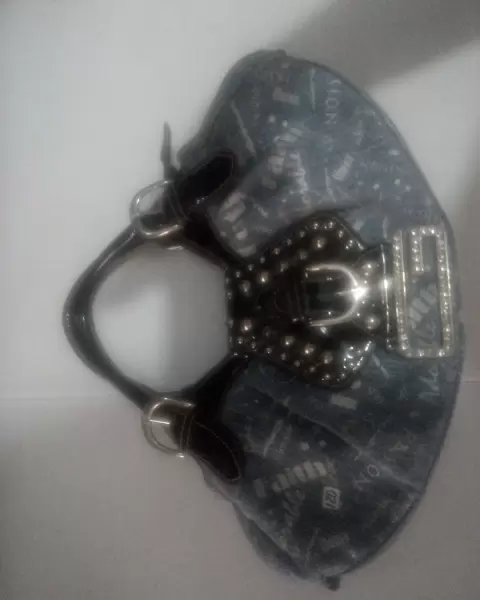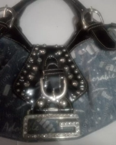 Bolsa de mano color mezclilla azul con un bonito decoracin al frent