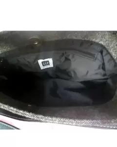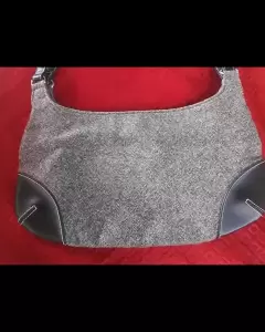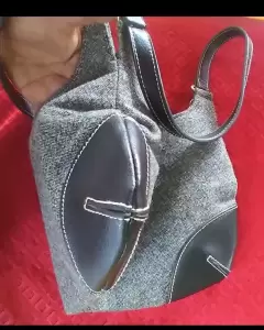 Bolsa de mano en tela como de lana, color gris y negro con vistas en las orillas de vinipiel negro igual que en la asa.