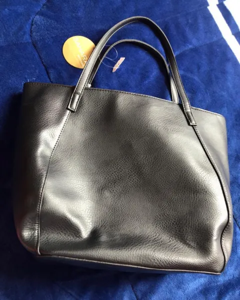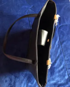 Bolsa de mano negra SAHARA WOMAN. Bolsa de mano color negro marca Sahara woman con decoración de cierres al frente tiene etiqueta, medidas 37 cm de ancho y 29 cm de largo. Material 100% poliuretano