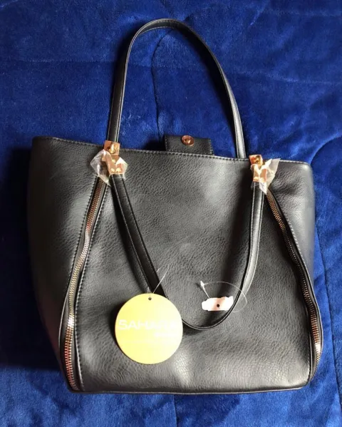 Bolsa de mano color negro marca Sahara woman con decoración de cierres al frente tiene etiqueta, medidas 37 cm de ancho y 29 cm de largo. Material 100% poliuretano