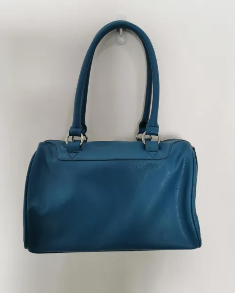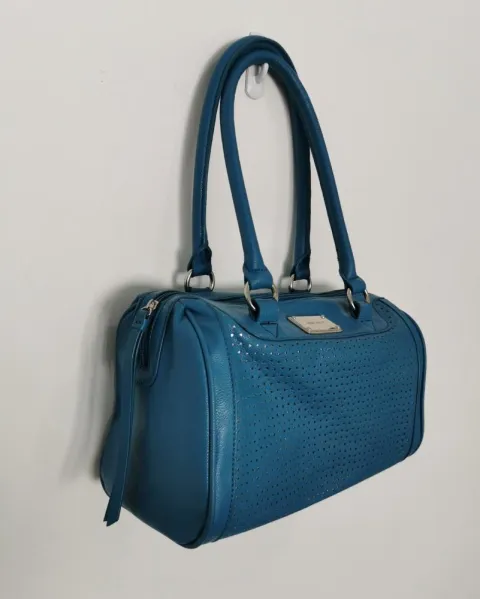 Bolsa de mano. Acabado muy suave tipo piel. Color celeste. Al frente tiene perforaciones con el fondo en plata. Los herrajes son en color plata. El forro es en tela color beige. Tiene 3 bolsillos en el interior, uno de jareta con siper en uno de los costados y 2 de parche en el otro costado. El forro tiene una mancha en el fondo.