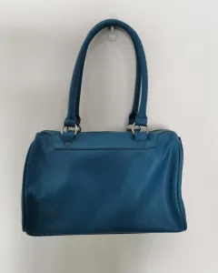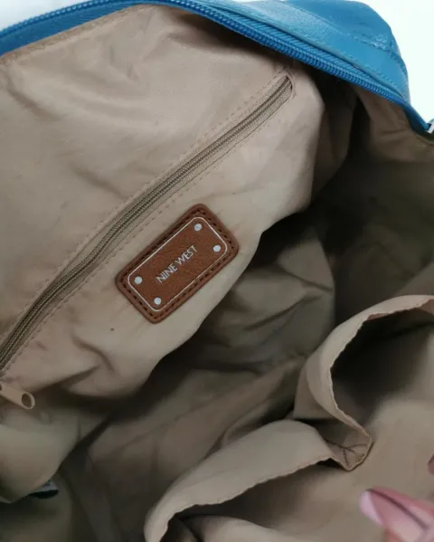 Bolsa de mano Nine West. Bolsa de mano. Acabado muy suave tipo piel. Color celeste. Al frente tiene perforaciones con el fondo en plata. Los herrajes son en color plata. El forro es en tela color beige. Tiene 3 bolsillos en el interior, uno de jareta con siper en uno de los costados y 2 de parche en el otro costado. El forro tiene una mancha en el fondo.