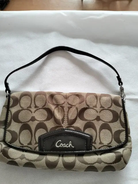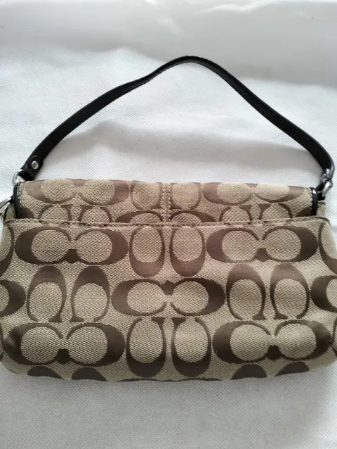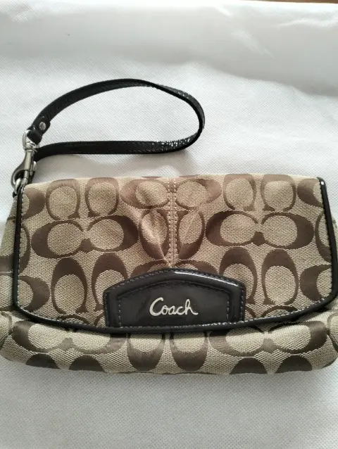 Mini bolsa de mano vintage se puede usar como bolsa o muñequera coach en lona y charol tiene compartimentos para tarjetas billetes y monedas cabe el celular