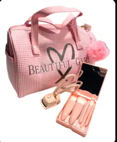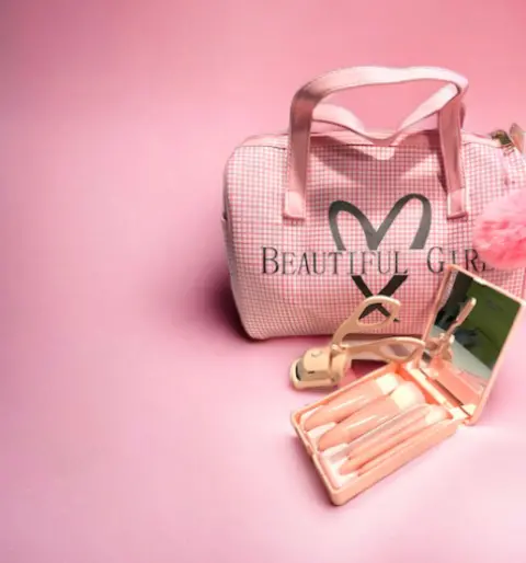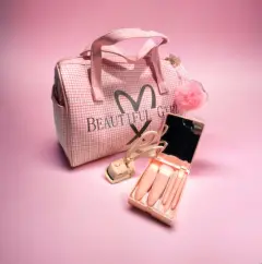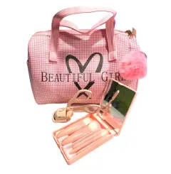 Hermosa Bolsa de Vinyl impermeable, Gran Capacidad, acompañado de un hermoso Enchinador de Pestañas Eléctrico y un Juego con Caja de 5 Brochas para Maquillaje.
