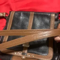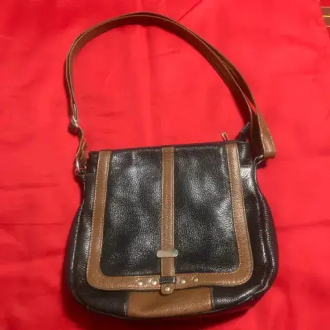 Práctica bolsa de piel azul con café, 24X23X$7 cm, sin detalles, las asas completo buen estado, sin talladuras, 3 compartimentos.