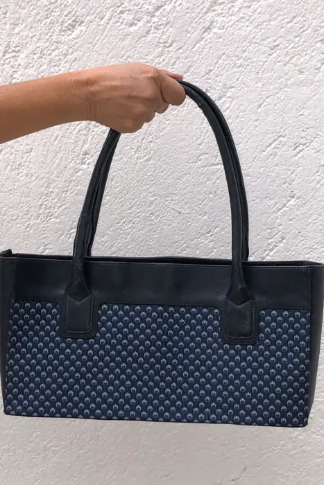 Bolsa de mano de tonos azules y detalles blancos. Un bolsillo y un cierre en su interior.
