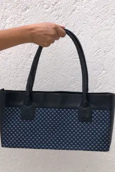 Bolsa elegante azul. Bolsa de mano de tonos azules y detalles blancos. Un bolsillo y un cierre en su interior.
