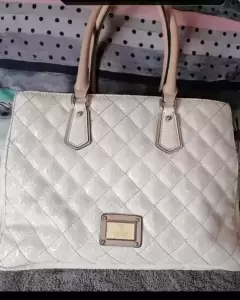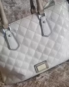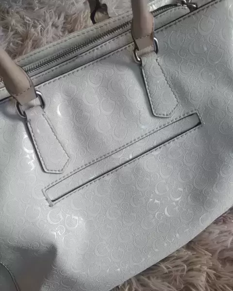 Hermosa bolsa Guess de uso con mínimos detalles como raspones, No afectan su vida de uso, color blanco aperlado brillante.Con 3 compartimientos, en medio concierre.Acepto Ofertas Razonables,.OJO❗❗Grabó vídeo de cómo mando mi prenda antes de envíar por Seguridad.