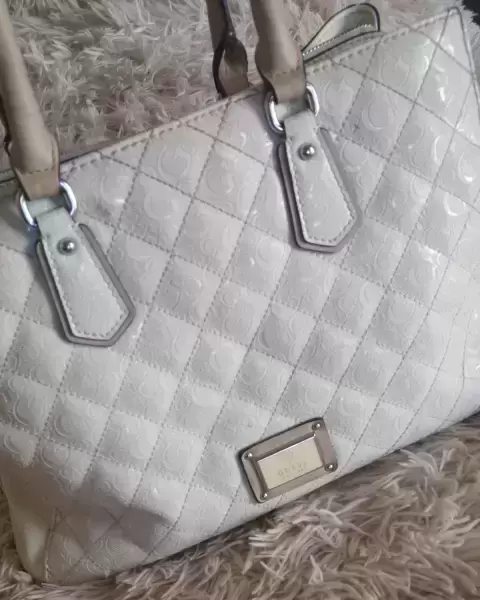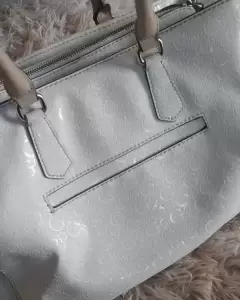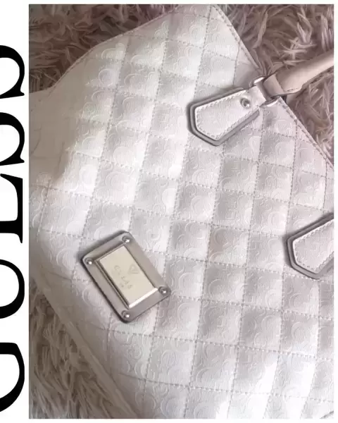 Bolsa GUESS Original Mediana. Hermosa bolsa Guess de uso con mínimos detalles como raspones, No afectan su vida de uso, color blanco aperlado brillante.Con 3 compartimientos, en medio concierre.Acepto Ofertas Razonables,.OJO❗❗Grabó vídeo de cómo mando mi prenda antes de envíar por Seguridad.