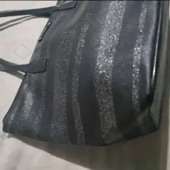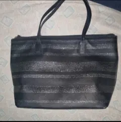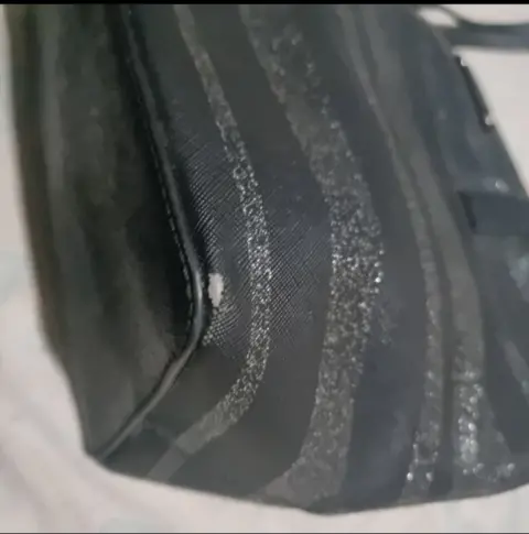 Bonita.bolsa solo minimos detalles de uso, por dentro está muy bien, bonito diseños de franjas de brillos plateados.