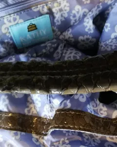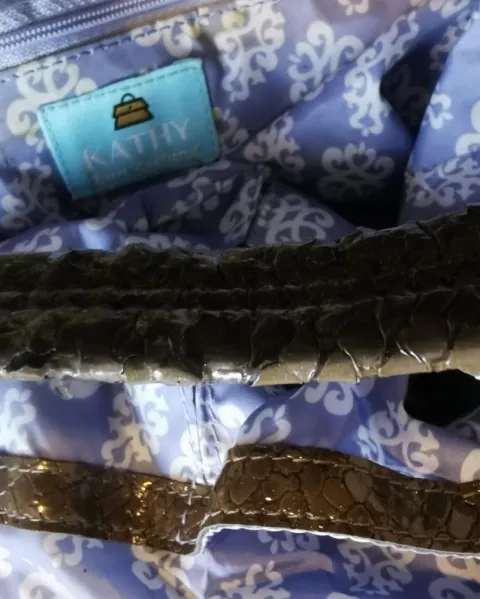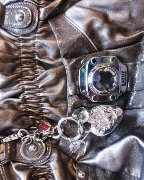 Hermosa bolsa color bronce. Kathy van Zeeland. Con aplicación y accesorios originales en cristal y metal.Está algo descarapelada de las asas y algunas manchas en el forro porque ha estado guardada.