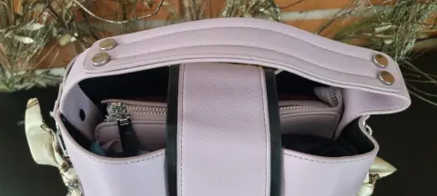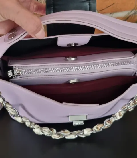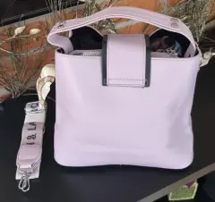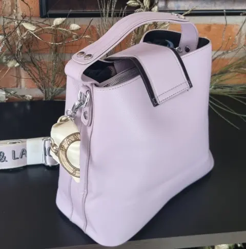 Lindísima bolsa color lila grisaseo, cuenta con asa de mano y correa ancha de tela estampada, muy en tendencia, está completamente nueva!💯💥💢