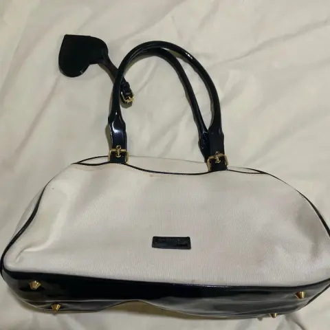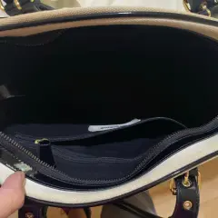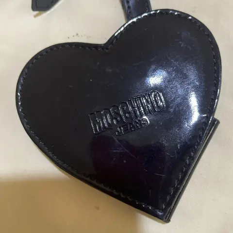 Bolsa de loneta color nude con detalles en charol negro. Con letras LOVE en charol negro. En buen estado, solo que la lo está se ha percudido y parece amarillenta en algunas zonas. Trae espejo en forma de corazón. Mide 34 cm x 20 cm x 14 cm. Tipo maletín de doctor.