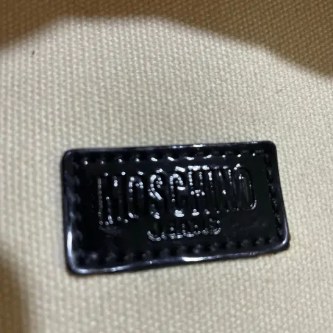 Bolsa LOVE Moschino. Bolsa de loneta color nude con detalles en charol negro. Con letras LOVE en charol negro. En buen estado, solo que la lo está se ha percudido y parece amarillenta en algunas zonas. Trae espejo en forma de corazón. Mide 34 cm x 20 cm x 14 cm. Tipo maletín de doctor.