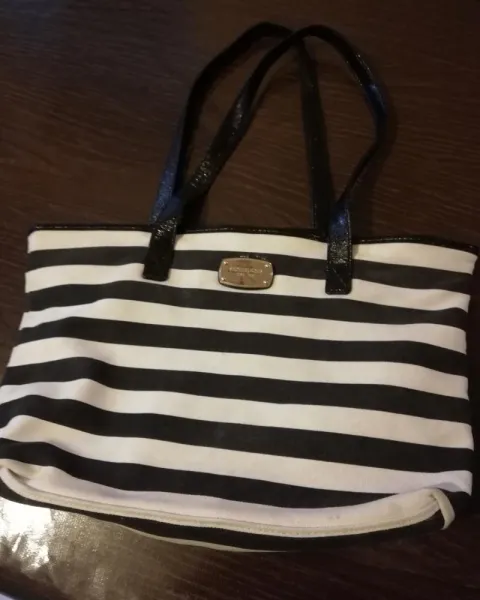 BOLSA MICHAEL KORS. Bolsa bicolor, es usada pero tiene aun mucha vida, se encuentra un poco despintada por lavarla es de tipo lona, tiene pequeñas manchas pero se quitan al lavarla