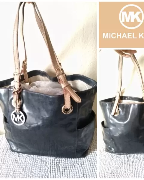 Bolsa MK. Bolsa Michael Kors en color negro de charol con detalles de uso en las asas de piel ya que es común al ser donde mas se usa, tiene pelada las cuatro esquinas de la parte de abajo así como en la parte de adentro se le está pelando el brillo de la bolsa(tercera foto), esta manchado el forro y se esta desgastando en algunas partes el plástico brilloso como se ve en la penúltima foto No está rota ya que tiene la tela de abajo solo se esta rompiendo el plastico brilloso.Mide 41 cm de Ancho X 27 cm de Alto.Te invito a buscarla con su numero de código $$ antes de OfertarOFERTA>>RAZONABLEOJO!! Grabo antes de enviar por seguridad de mi prenda, corroborando su estado 👁️👁️