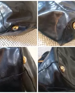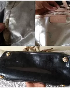 Bolsa Michael Kors en color negro de charol con detalles de uso en las asas de piel ya que es común al ser donde mas se usa, tiene pelada las cuatro esquinas de la parte de abajo así como en la parte de adentro se le está pelando el brillo de la bolsa(tercera foto), esta manchado el forro y se esta desgastando en algunas partes el plástico brilloso como se ve en la penúltima foto No está rota ya que tiene la tela de abajo solo se esta rompiendo el plastico brilloso.Mide 41 cm de Ancho X 27 cm de Alto.Te invito a buscarla con su numero de código $$ antes de OfertarOFERTA>>RAZONABLEOJO!! Grabo antes de enviar por seguridad de mi prenda, corroborando su estado 👁️👁️