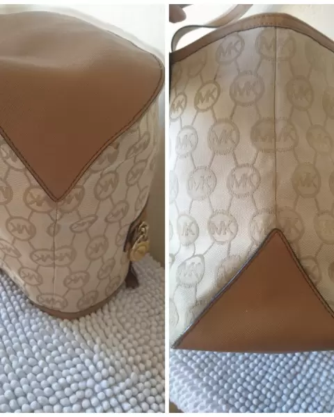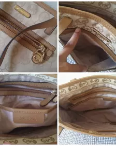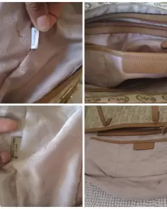Bolsa Michael Kors mediana de tela en color súper combinable hermosa y prácticamente sin detalles solo único detalle es en las asas tiene cuarteaduras común ya que es donde más se usa la bolsa está intacta cómo se puede ver en las fotos hagan some si es necesario mide 37 cm de ancho por 25 de altoSolo ferta razonable te invito a buscarla con su código cuánto cuesta antes de ofertar