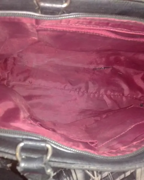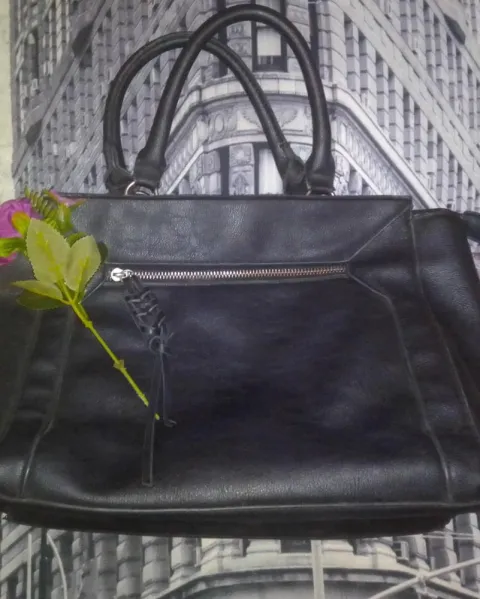 Hermosa Bolsa Negra de Piel, Marca Sahara , con detalle de trenza en el cierre de enfrente , no esta descarapelada , las asas el unico detalle es que estan un poco descocidas pero no estan descarapeladas y el cierre principal esta un poco decolorado , mantiene su color negro muy bien y se encuentra forrada por dentro.