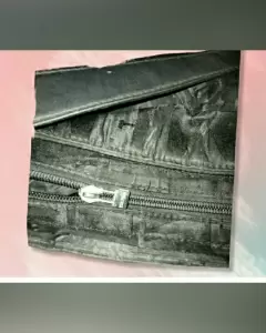 Bolsa negra de piel y tela. Trae correa y cierre. Con un bolso externo que cierra con Velcro. Mide 30x16x10cm. Tiene un mínimo desgaste en la correa, imperceptible. Es de base dura.