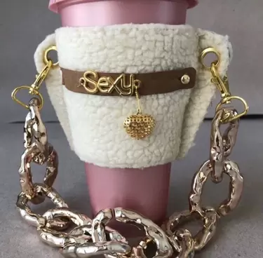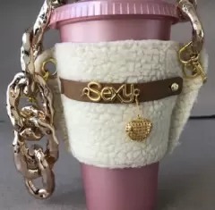 Bolsa para café de borrega con cadena gruesa intercambiable con dije con la palabra sexy y corazón dorado muy linda y en tendencia.