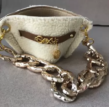 Bolsa para café de borrega con Cadena gruesa. Bolsa para café de borrega con cadena gruesa intercambiable con dije con la palabra sexy y corazón dorado muy linda y en tendencia.