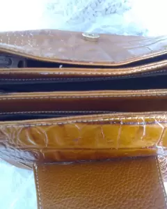 De lujo. Piel fina, tipo de trabajo amartillada por el tipo de dibujo. Varios departamentos. Ligera, cómoda se cierra con imán. De vestir o para diario, siempre lucirás cool. Color miel.