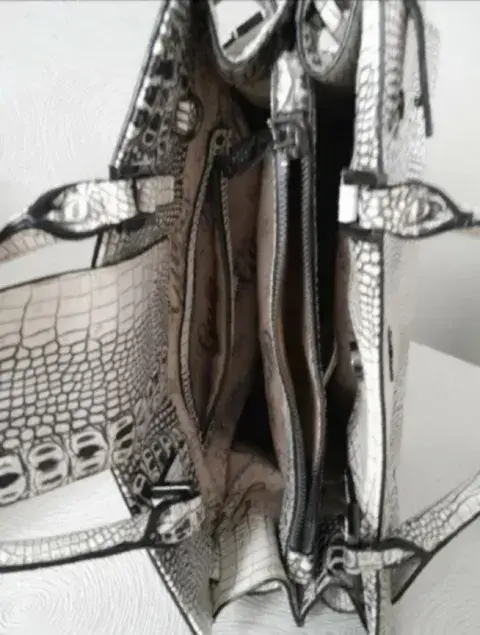 Hermosa bolsa tote Guess color blanco/negro snake, con asas para uso de mano o al hombro, una sola puesta, interior muy amplio con 3 compartimentos a lo ancho de la bolsa, y otros mas pequeños para tarjetas y celular, bolsillos con zipper al interior y al exterior. Viene con cubrepolvo. Especial para cualquier época del año.