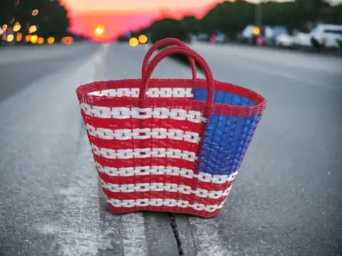 Bolsa tejida a mano hecha por artesanos mexicanos de plástico rígido simulando la bandera de Estados Unidos ideal para la playa, para ciudad, para el supermercado, puedes lavarla con agua si se llena de arena o puedes usarla para el diario.